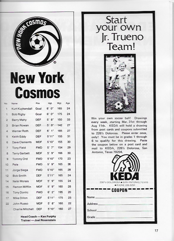 Before the 1976 season, Pele and the Cosmos went on a six-match preseason trip to generate interest throughout the league. San Antonio was the third stop on this tour, three days after Pele was the featured attraction for the opening of the renovated Ownby Stadium in Dallas. On March 28th, New York beat the Dallas Tornado 1-0 on what press accounts described as a “picture-perfect” Pele free-kick.