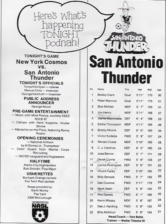 Taking full advantage of the opportunity to showcase Pele, the Thunder hosted multiple youth clinics, including one he attended at a local school, a press conference, and a reception at the Gunter Hotel in downtown San Antonio where the Cosmos were staying.
